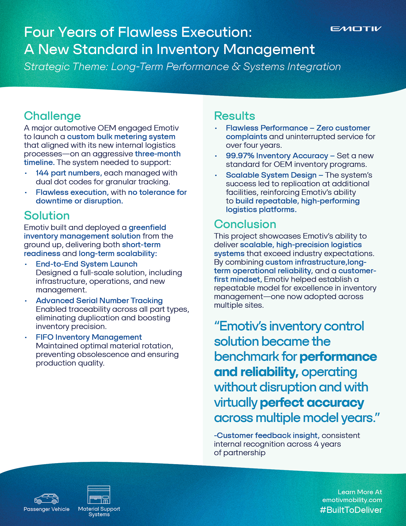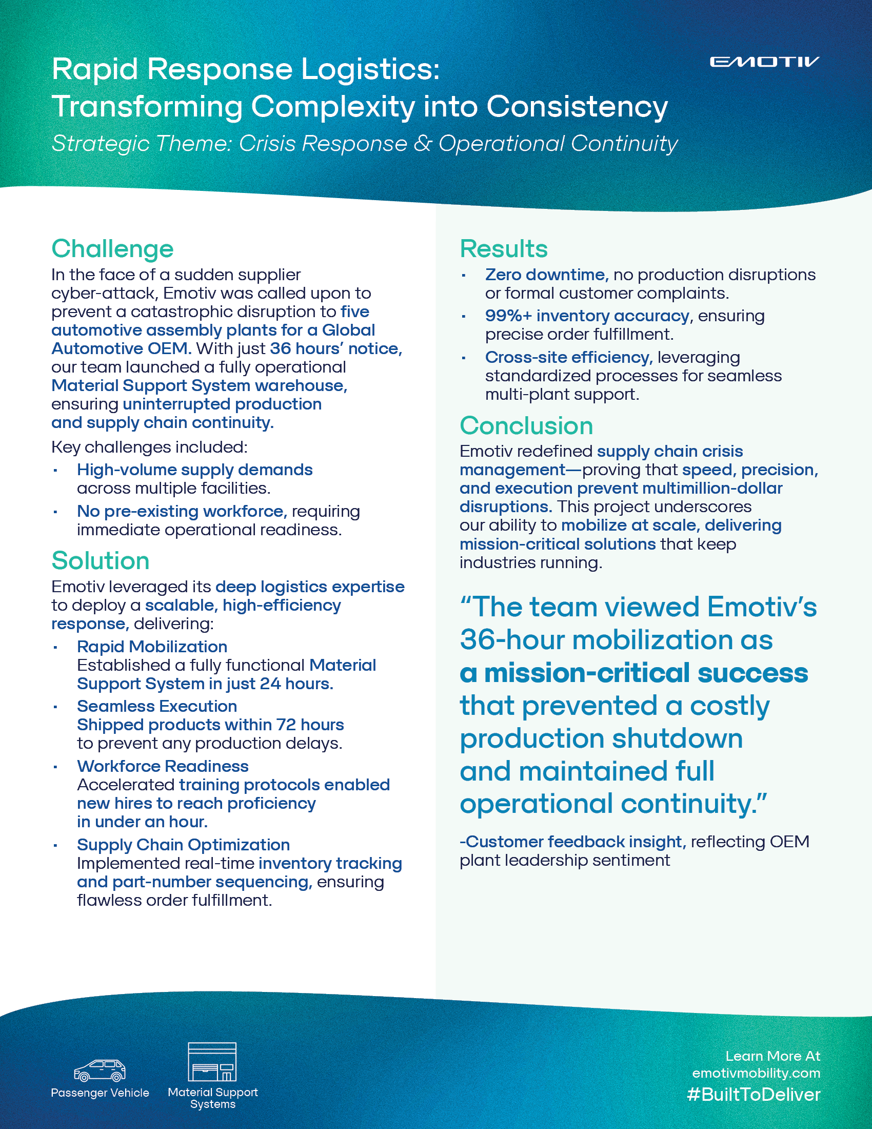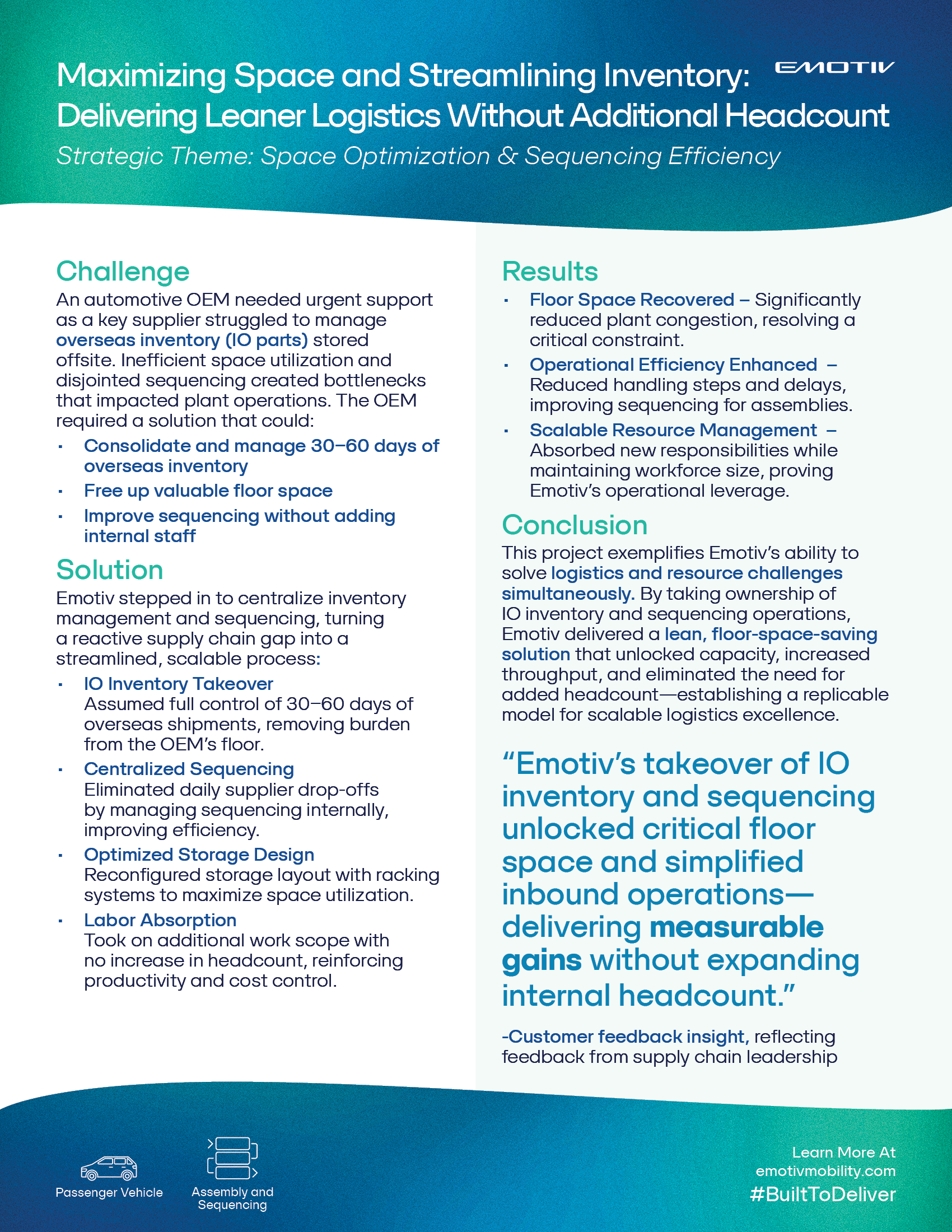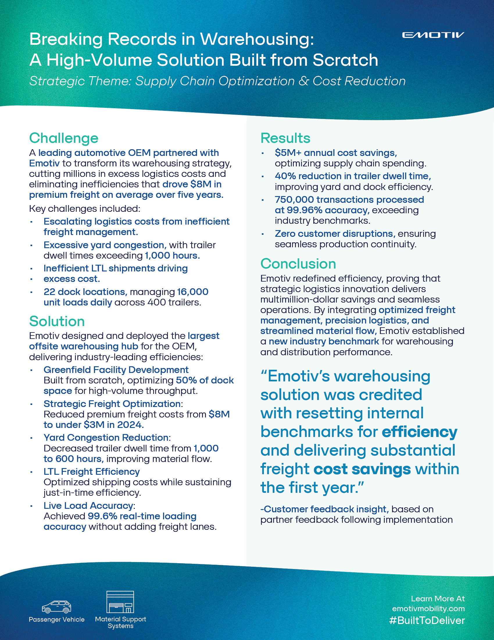 Emotiv is a global leader in transportation innovation, offering forward-thinking solutions like value-added assembly, 3PL services, and sustainable advancements for industries including automotive, aerospace, and energy.