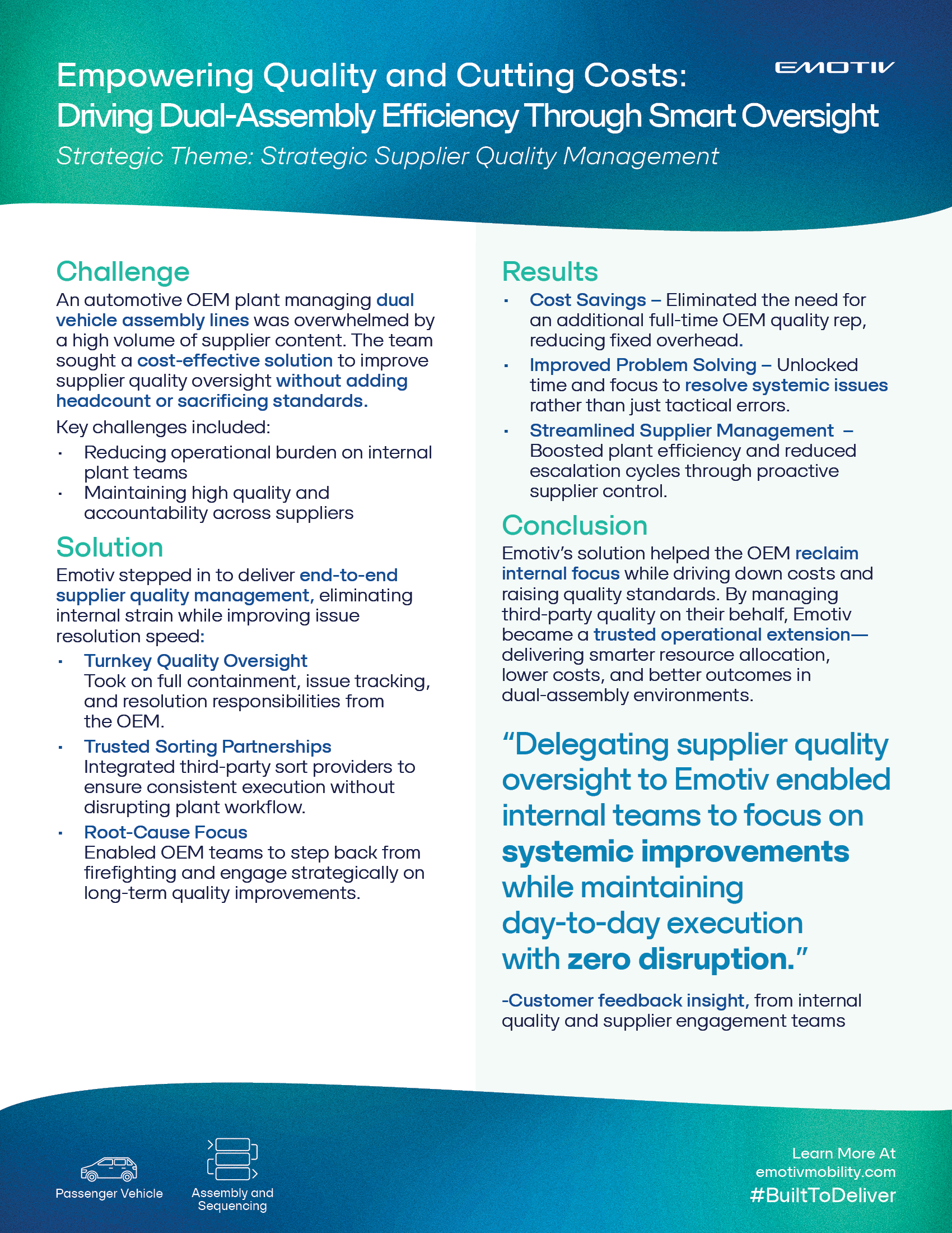 Emotiv serves automotive OEMs, commercial vehicles, aerospace, energy, and industrial manufacturing sectors. Our tailored, scalable solutions are designed to help businesses achieve operational excellence and sustainable growth.